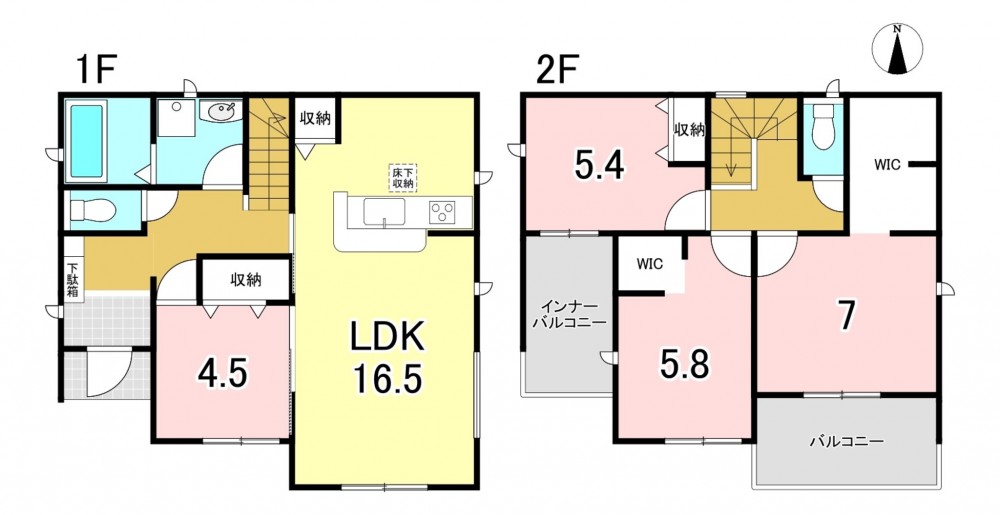 - システムキッチン、カウンターキッチン、シャンプードレッサー、洗浄便座、浴室乾燥機、追い焚き、複層ガラス、ウォークインクローゼット、モニタ付インターホン、床下収納、エコキュート、トイレ2箇所